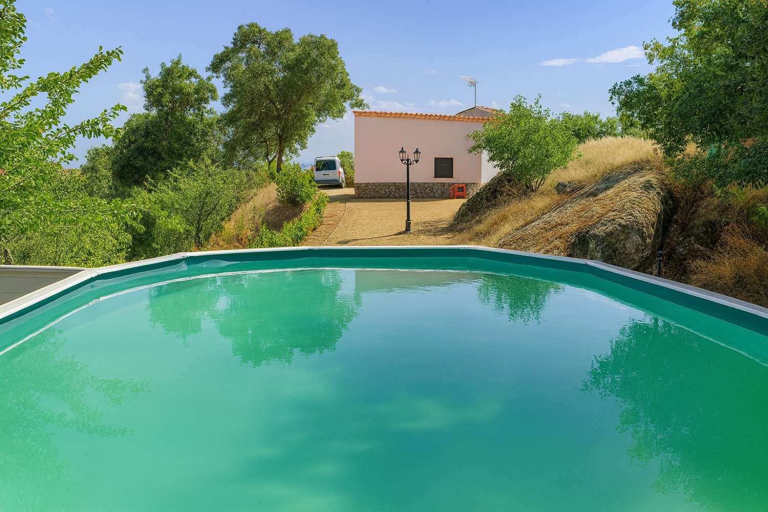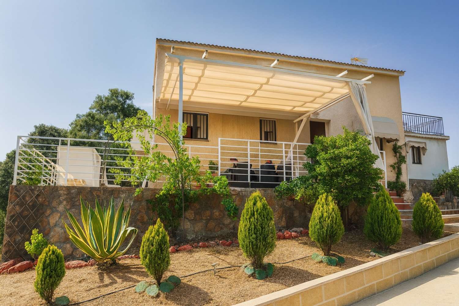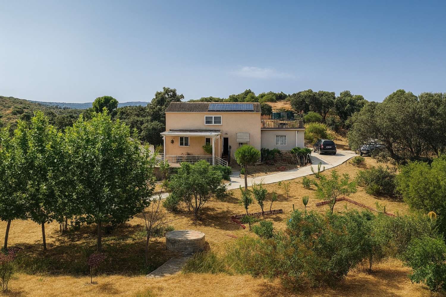 La finca cuenta con 12.604 m² de terreno privado lleno de árboles (olivos, higueras, frutales y zonas ajardinadas), pozo propio con depósitos de agua, placas solares, generador y fosa séptica. Todo lo que necesitas para vivir con total independencia y autosuficiencia.