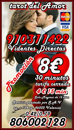 TAROT VISA CON TARIFA CERRADA /TAROT DEL AMOR /VIDENCIA 910311422 VISA desde 4€ 15 min/ tarot del amor , de Pareja , Amistad , también en temas Laborales, Familiares, Económicos… videntes psíquicas expertas Servicio prestado por S.A.V. ap. c 164 cp. 46002 Valencia. Solo mayores de 18 años. Llamada a teléfono sin coste adicional. Visa 910 311 422 / 806 002 128 desde Coste min. 0, 42/0, 79 cm € min red fija/móvil. Videncia, Tarot, Tirada del Amor, rituales, péndulo, Numerología, Runas, sueños.